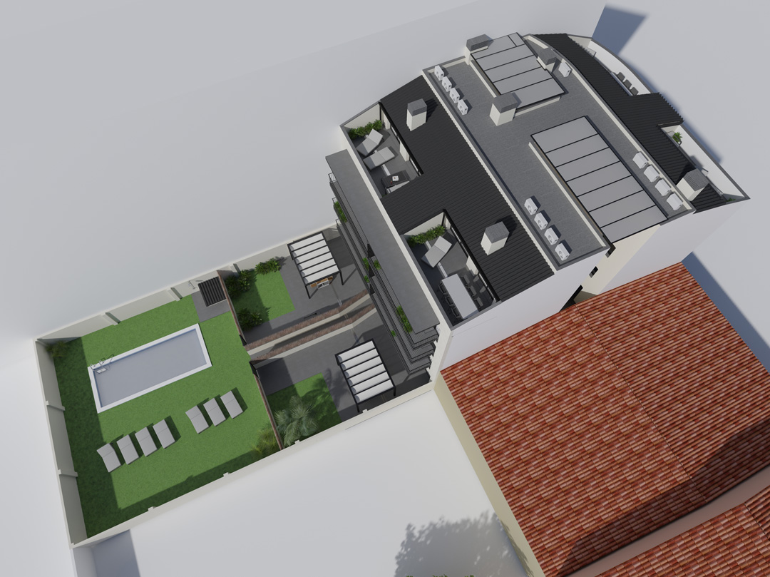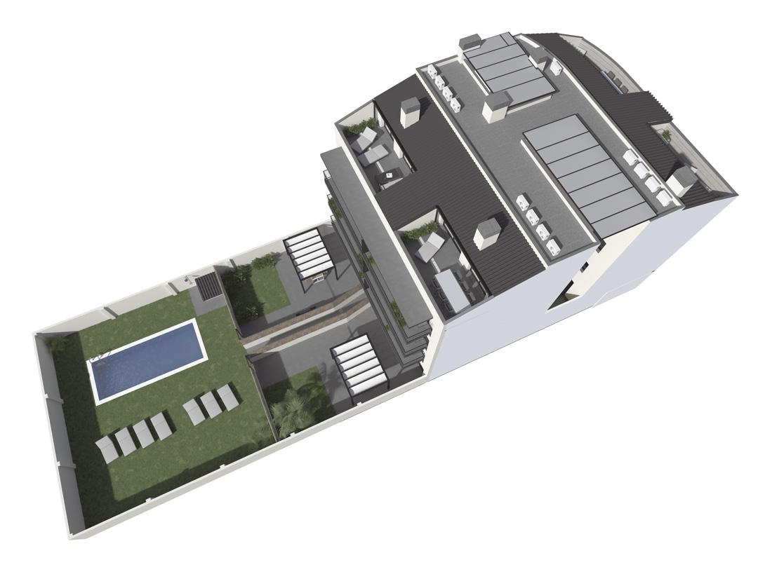 El edificio cuenta con 12 pisos y 1 local. Cuenta con un garaje subterráneo con plazas de aparcamiento y trasteros. Lo más destacado es la piscina compartida, que se encuentra en el patio interior.